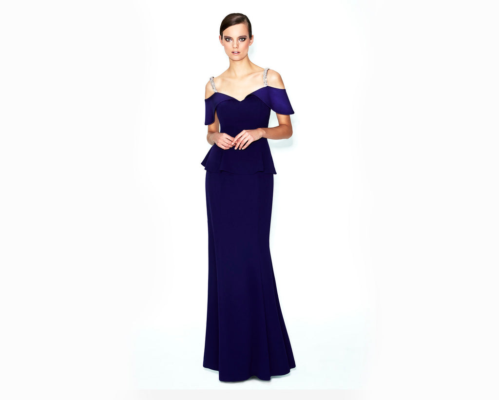 Make a statement in the Alexander by Daymor 550 Long Formal Peplum Evening Dress. This stunning gown features elegant off-shoulder sleeves with embellished straps for a touch of sparkle. The flattering peplum detail accentuates the waist, while the sleek sheath skirt creates a graceful silhouette. A sweetheart neckline adds a romantic touch, making this dress perfect for galas, weddings, and special occasions. Designed for timeless elegance, this gown ensures you stand out in any crowd.