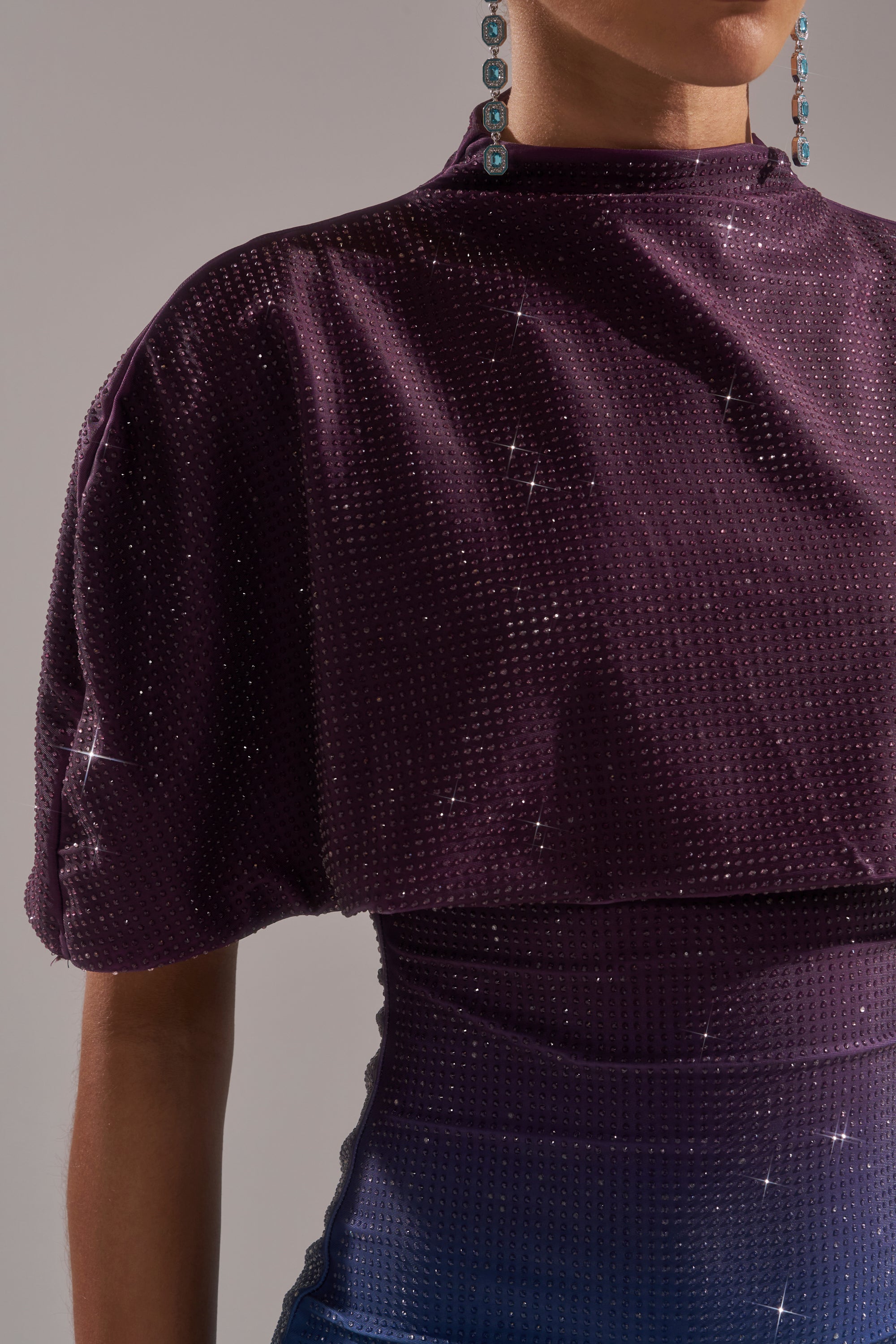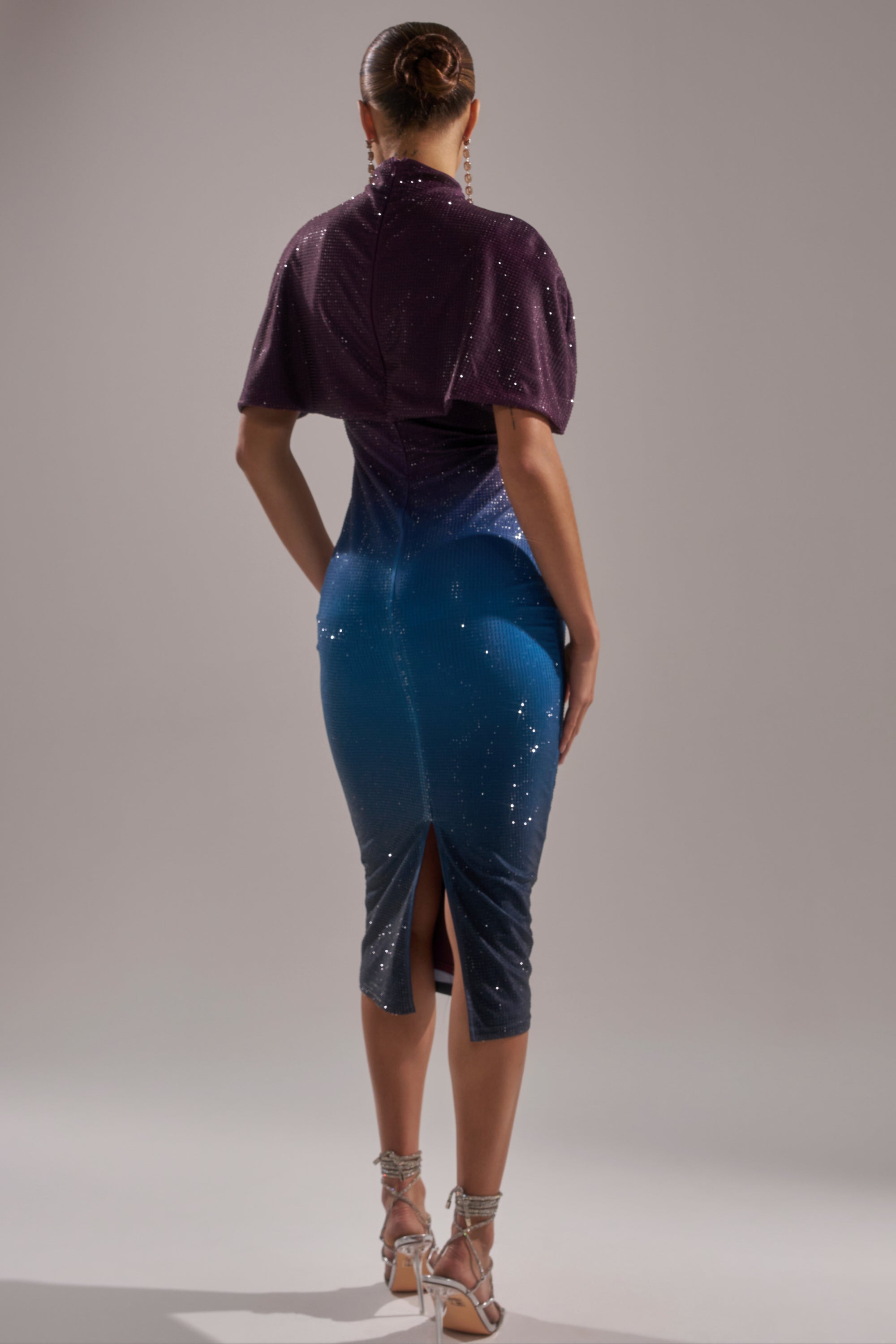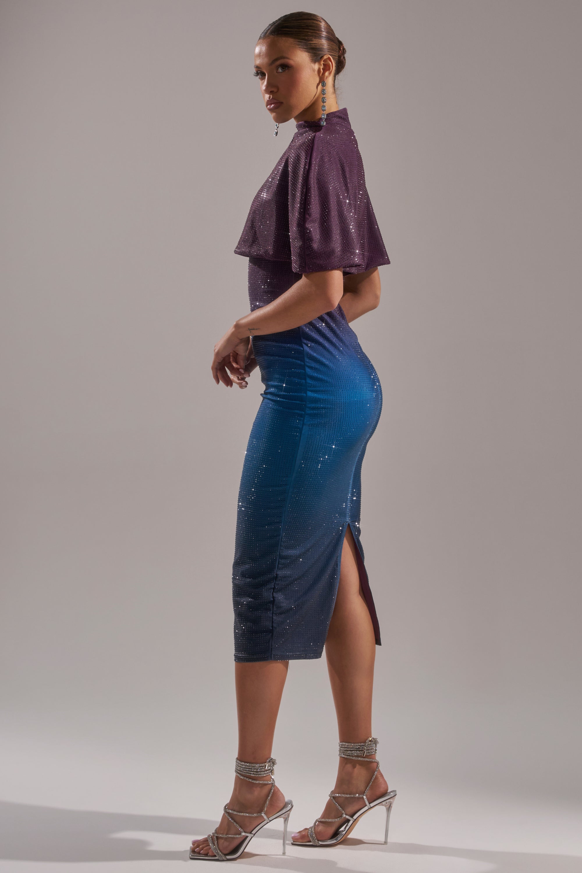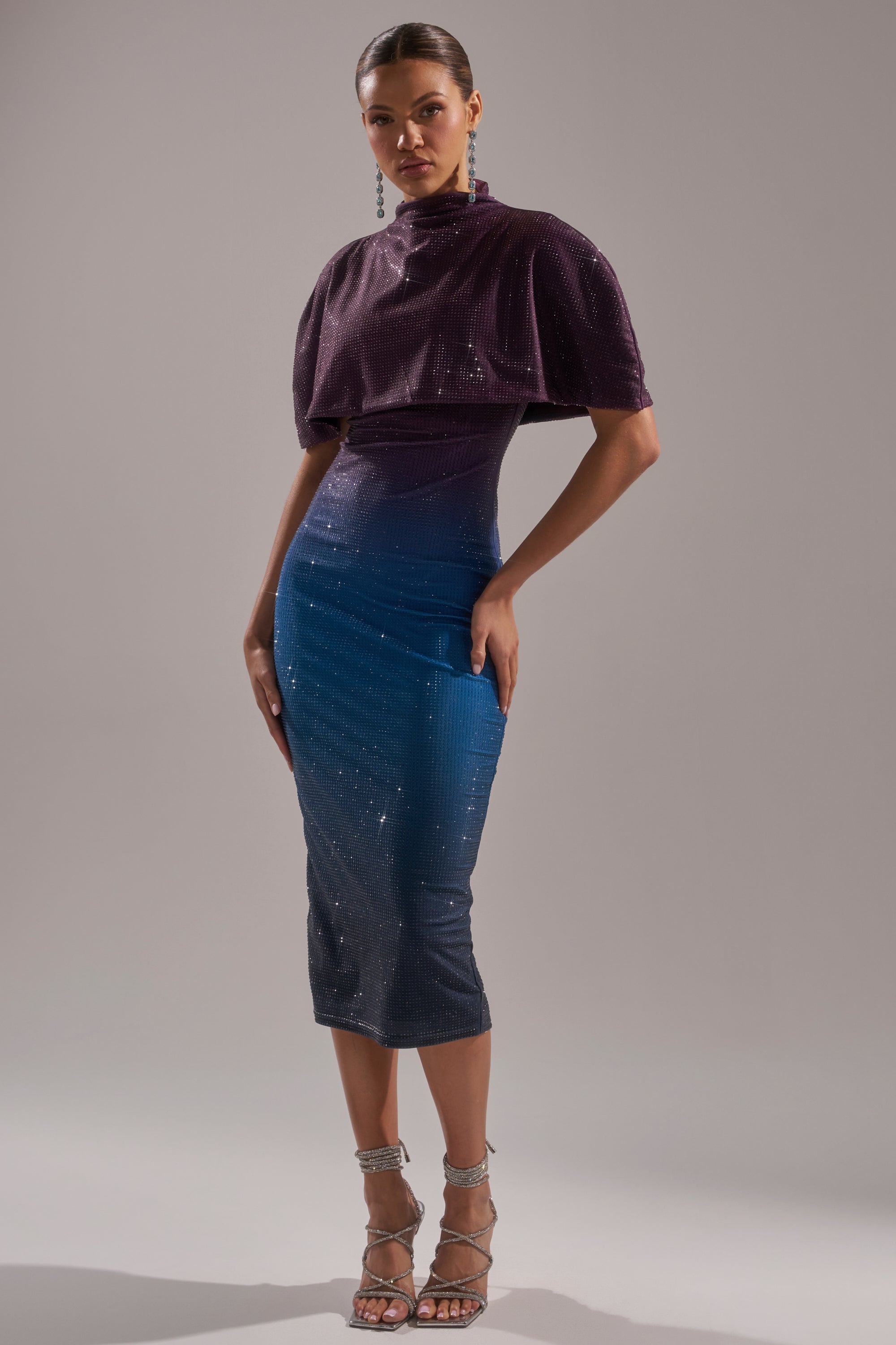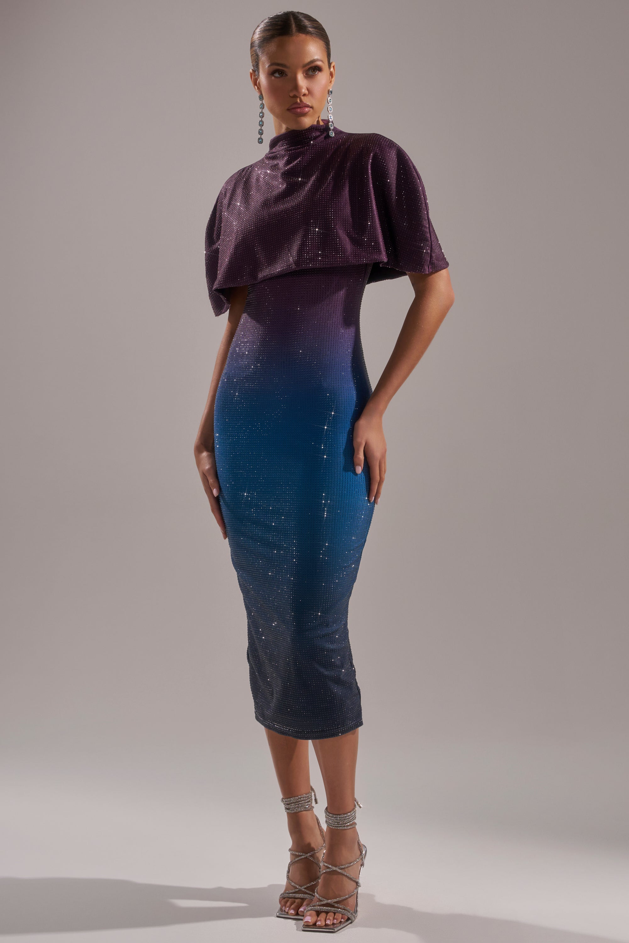 The AKIRA Label Chic AF Rhinestone Midi Dress is full-throttle glam. Crafted from a sleek stretch fabric in a purple to blue ombre colorway, this stunning style features a built-in shawl-style overlay that drapes effortlessly across the shoulders, a sleeveless design, and a concealed back zipper closure. It’s totally adorned in glittering rhinestone embellishments. Complete with a bodycon, midi-length silhouette. Perfect for cocktail hours, holiday parties, or upscale nightlife.