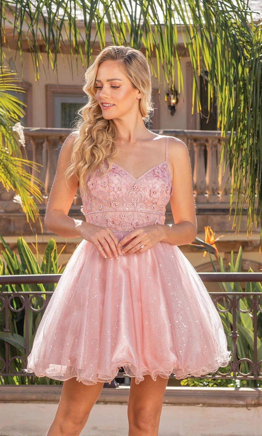 Sweet and saucy, this short babydoll homecoming dress shimmers under the lights. For a sparkly look at homecoming, wedding receptions, and sweet-16 parties, slip into this lace-up short babydoll party dress and watch heads turn. In misses and some plus sizes, this short semi-formal dress features an embellished v-neck bodice and thin shoulder straps that lead to the lace-up open back, while the multi-layered short babydoll skirt flows to the rolled hemline in an a-line shape that finishes the look. Priced under $150, this short babydoll homecoming dress is as affordable as it is adorable.
