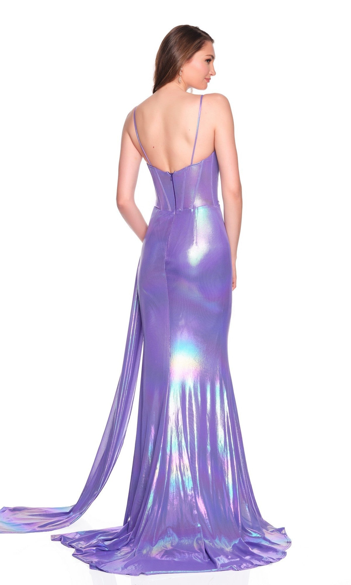 Metallic-purple sleeveless long prom dress by Dave and Johnny featuring spaghetti straps, a fitted corset bodice with a cowl neckline, an open back with a zipper closure, and a wrap-style skirt with a 3D rosette applique at the side waist and a floor-length side sash.