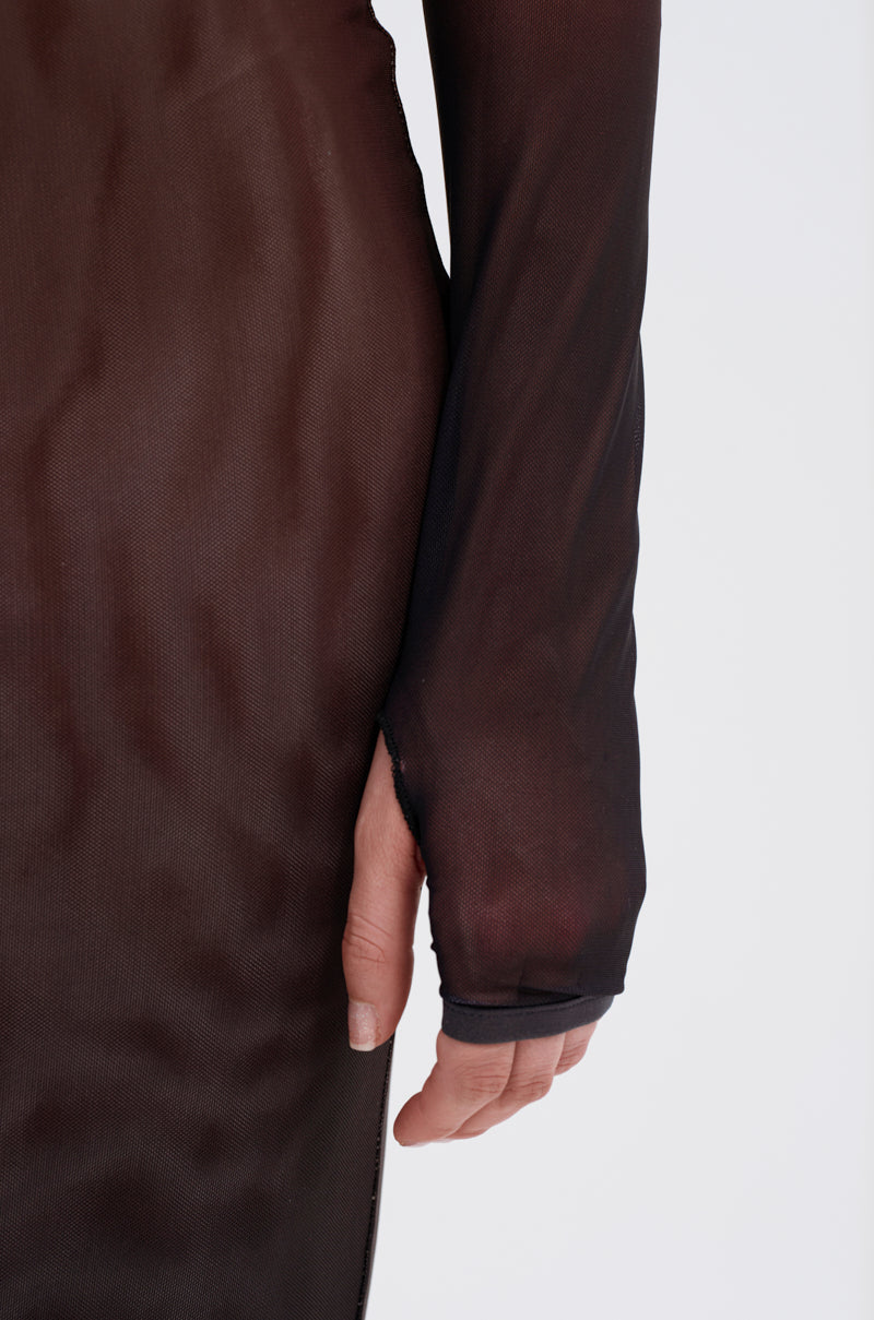 The AKIRA Label Fifty Shades Ombre Midi Dress is designed to make a sleek, modern statement. This bodycon midi dress features a stunning ombré fade from light nude to deep black, crafted from a sheer mesh material that hugs your curves perfectly. With long sleeves, thumbhole details, and a mock neckline, this dress balances sexy and sophisticated for an elevated night-out look. Pair it with strappy heels and bold accessories for maximum impact. Ideal for cocktail parties, dinner dates, or any occasion where you want to stand out.