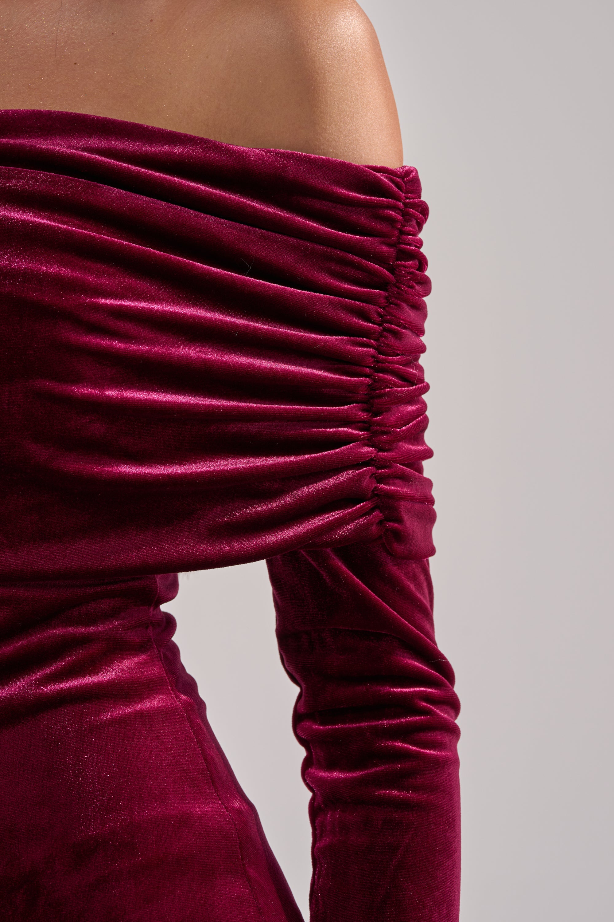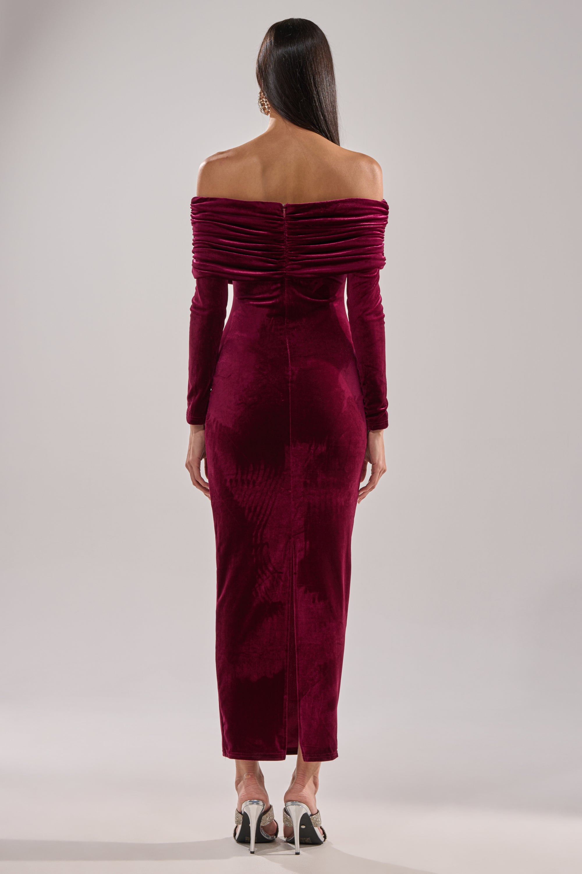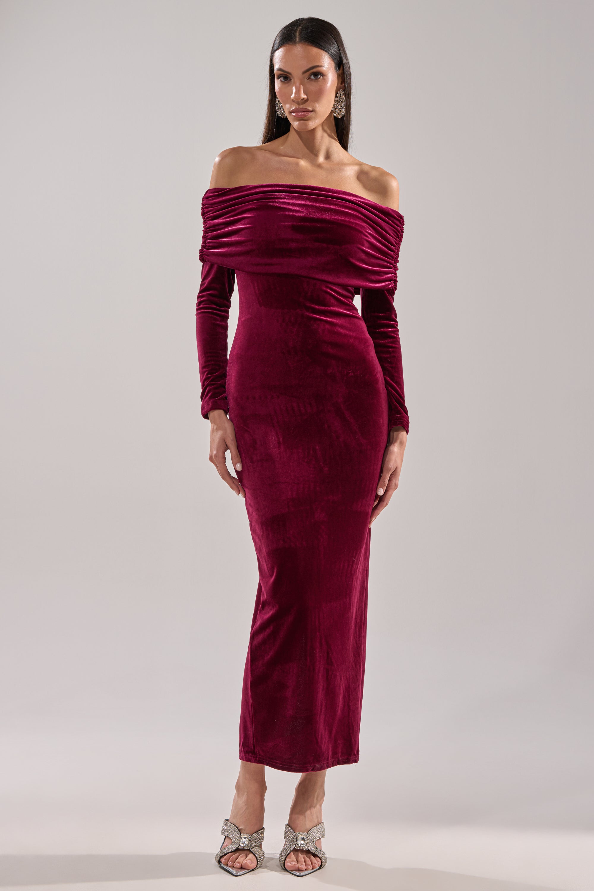 The AKIRA Label In The Air Velvet Maxi Dress features an off-the-shoulder neckline with elegant draped detailing and long sleeves for a timeless, refined look. Crafted from soft stretch velvet, the gown hugs the body to create a smooth, sculpted silhouette. A sleek interior lining ensures comfort throughout wear, while the tonal back zipper closure offers a clean, seamless finish. Perfect for formal occasions, this maxi dress delivers effortless sophistication with a touch of vintage glamour.