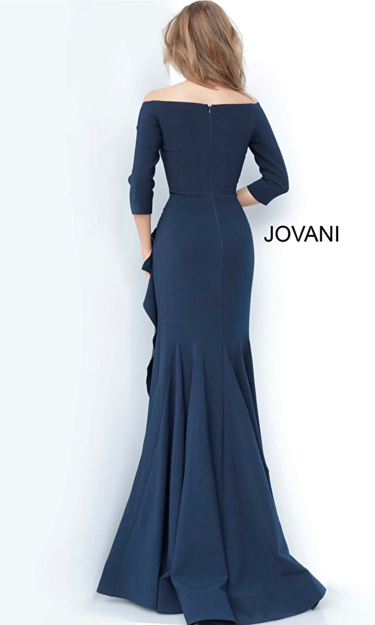 So classy, this three-quarter-sleeve long mother-of-the-bride dress 00446 is an upscale style that the bride will surely approve. Crafted in European stretch crepe from the princess-cut bodice to the hem, this long sleeve MOB dress embraces contemporary elegance for weddings, galas, and other fancy formal events. With stylish three-quarter sleeves, this eye-catching long formal dress offers a fitted look from the off-the-shoulder neckline to the floor. In misses and some plus sizes, this elegant evening gown has an asymmetrical drape with ruffles that cascade down the front of the skirt before it ends at a formal floor length. Get ready to elevate your allure when you choose to slip into this three-quarter-sleeve long MOB dress from Jovani.