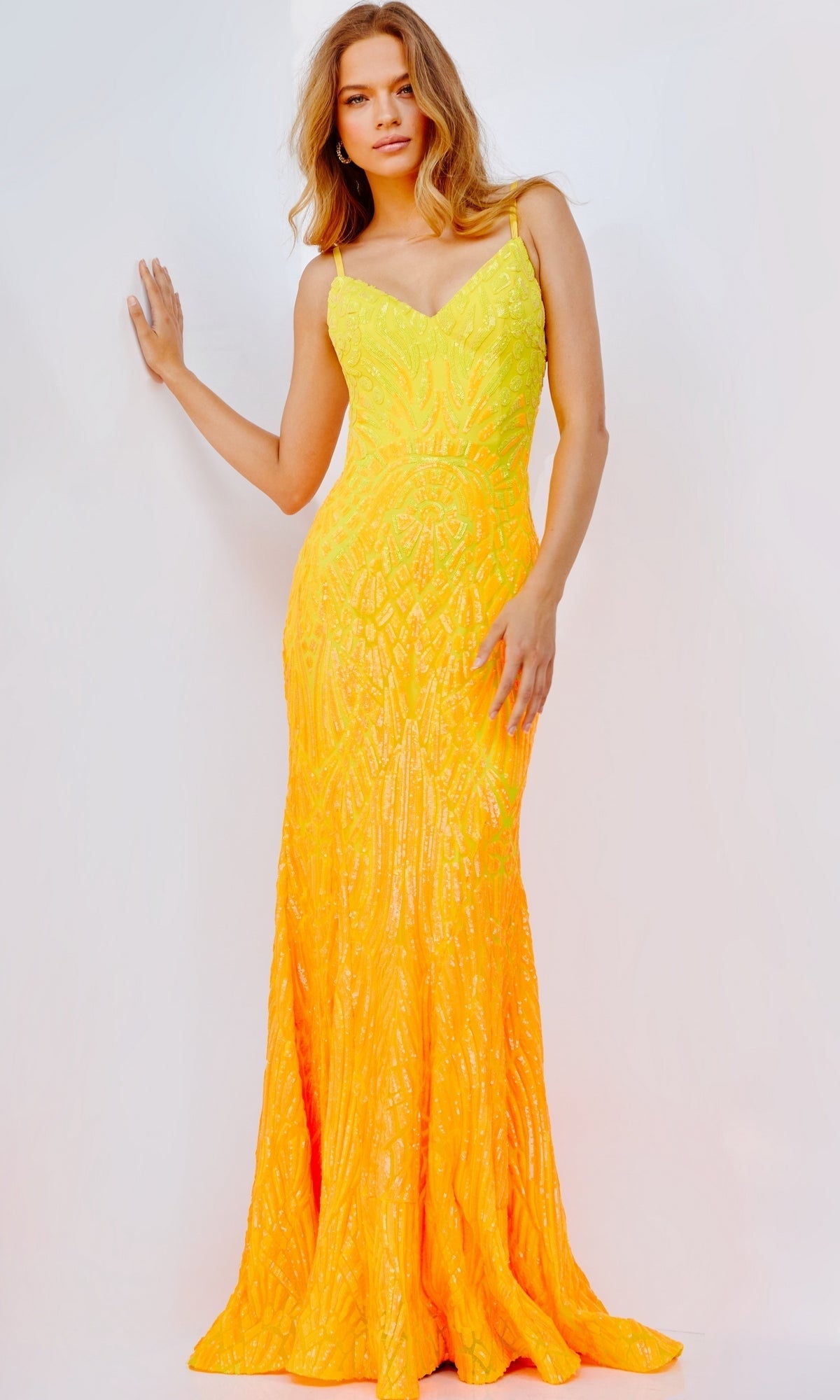 From Jovani, this backless long sequin-print prom dress 06450 is as figure-flattering as it is mesmerizing. With a gorgeous Ombre-style sequin print from the v-neckline to the hem, this long designer dress shimmers with every move at prom, galas, and other black-tie events. The long sequin-print formal dress that thin shoulder straps that lead to the open back, while the long mermaid skirt hugs the hips before ending at a dramatic floor length. A celebration of dazzling style, this open-back long sequin-print prom dress is undoubtedly the star of any show.