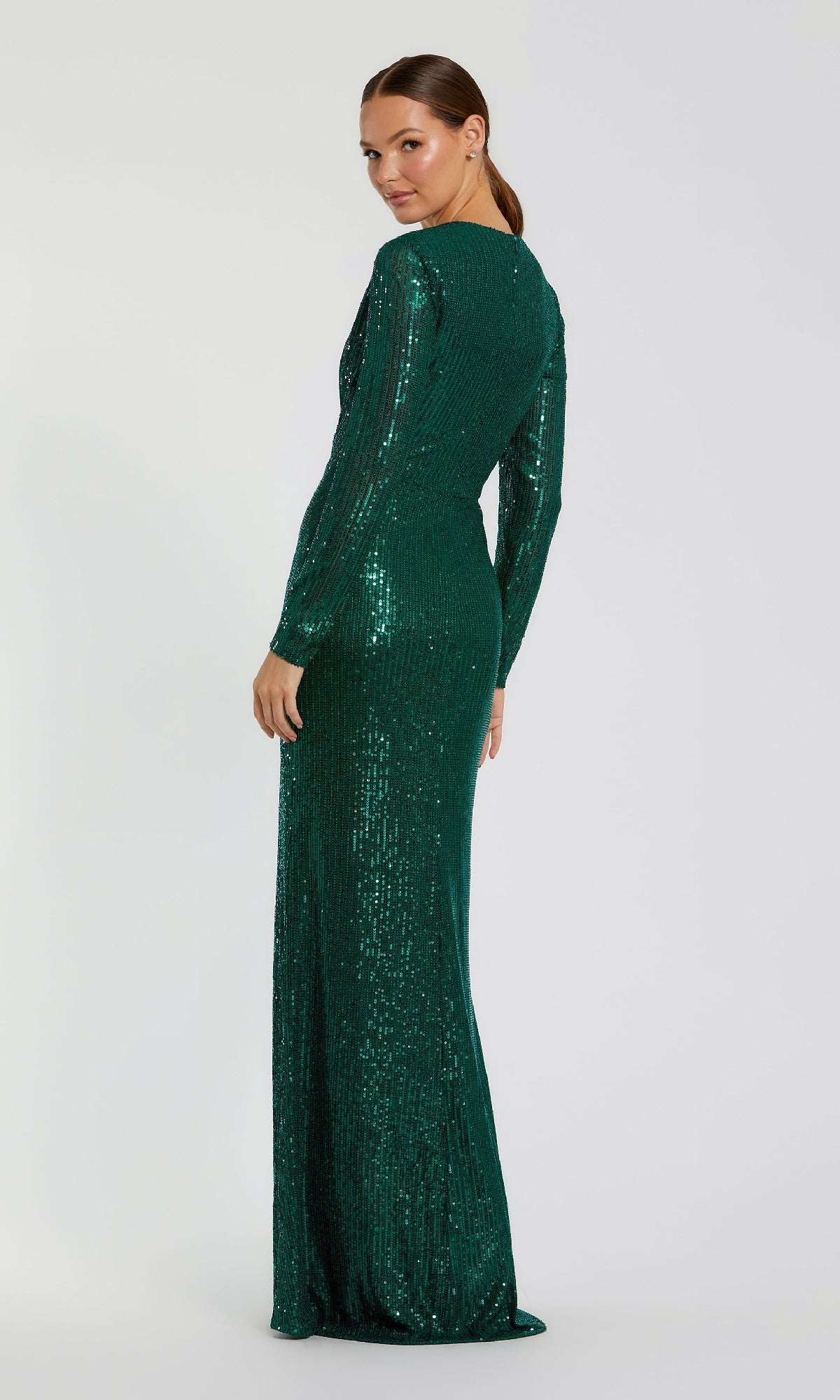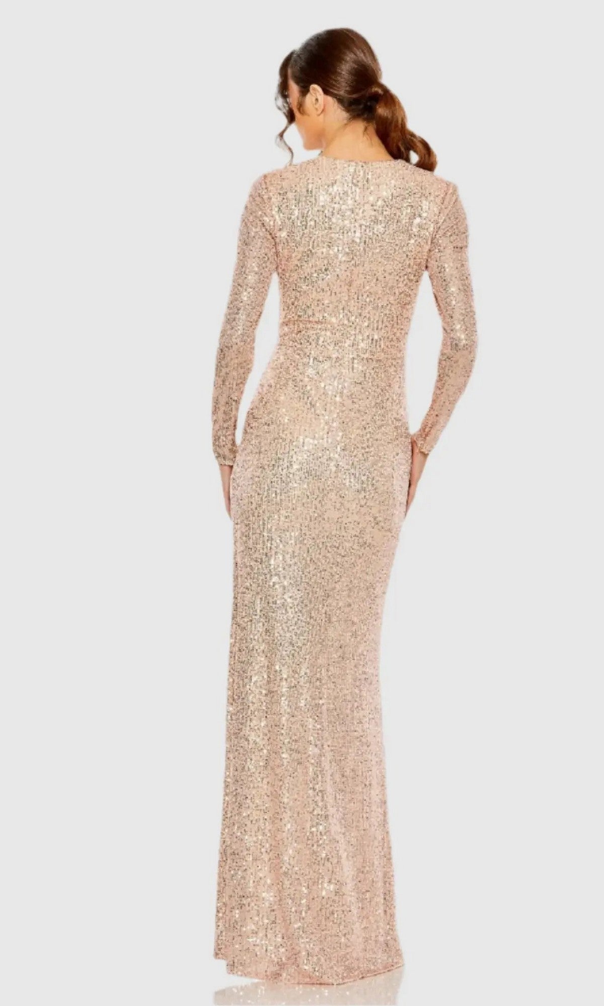 Celebrate your special evening in this long sleeve sequin formal dress by Mac Duggal. A modest style that is sure to shine at upscale weddings, galas, and other fancy formals, this long sleeve evening gown features sequins from the high neckline to the hem. Offered in misses and some plus sizes, this formal sequin dress has long sheer sleeves and a long skirt with a side-knot detail that offers an eye-catching look. A brilliant choice for the girl who loves to shine, this long sleeve formal dress is ready for the red carpet.