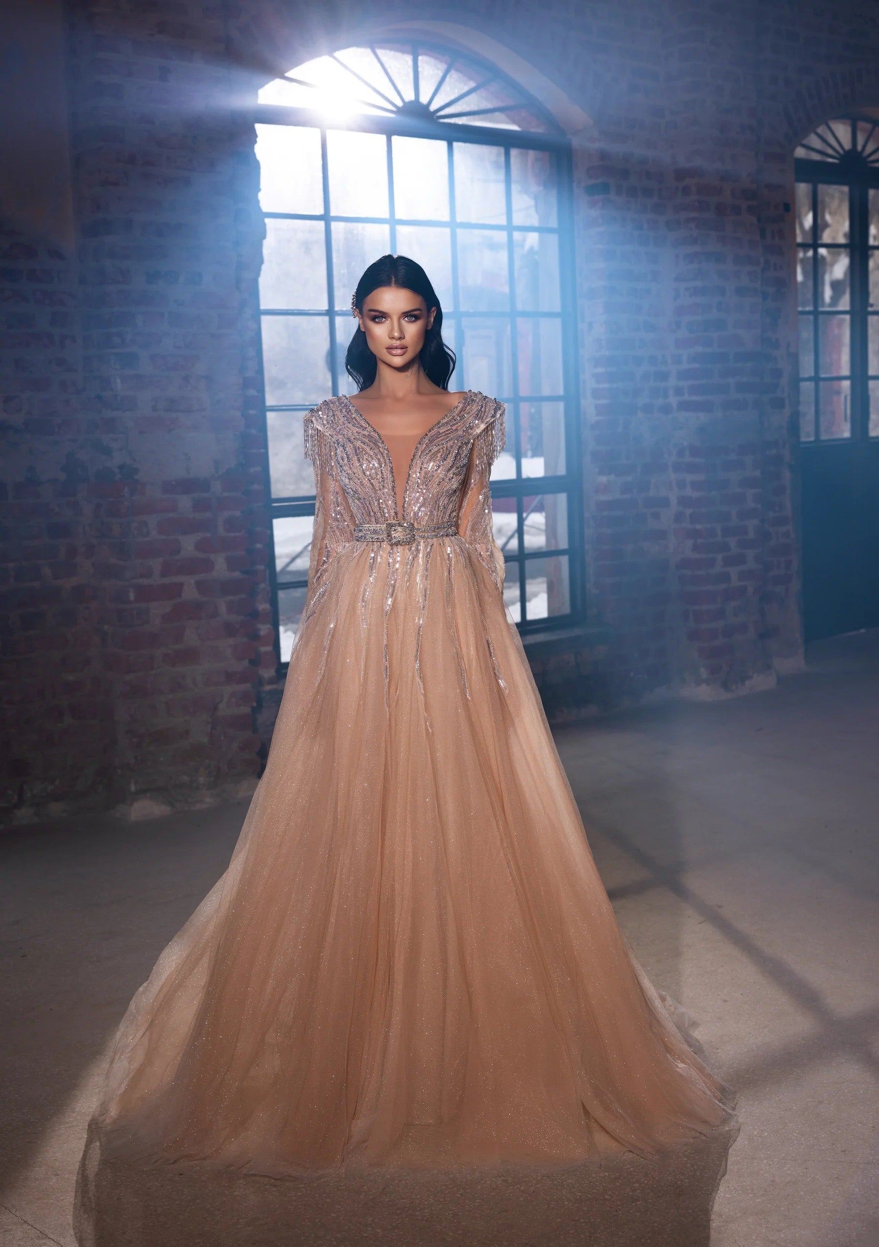 Step into elegance with the Modessa Couture M20362 evening gown. This stunning A-line dress features shimmering sequins over delicate tulle, creating a breathtaking, ethereal look. The long sleeves add a touch of sophistication, making it perfect for formal events, galas, or prom. With its flowing silhouette and dazzling details, this gown ensures you’ll shine with grace and confidence.