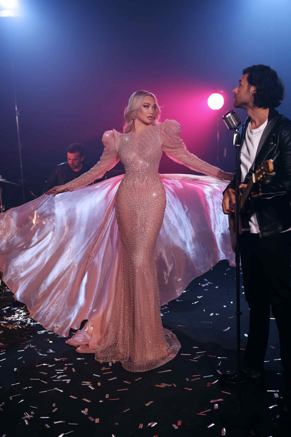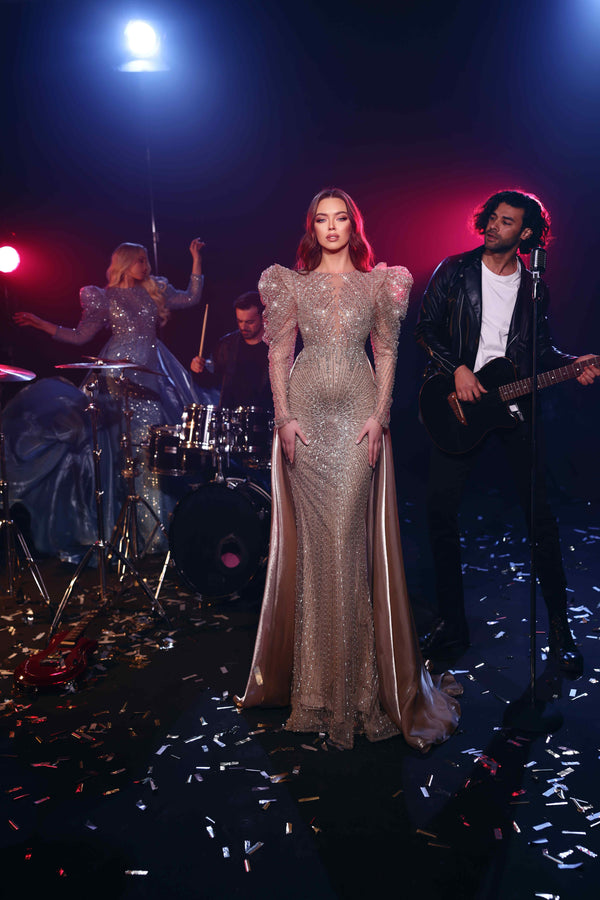 Prepare a memorable entry with the Modessa Couture M23516 Long Sleeve Formal Overskirt Evening Dress, the elegant dress made in a way that enables it to combine traditional elegance with contemporary sophistication. It is crafted using satin with a pattern of rich beads, which makes it shine with embroidery on any occasion. The long sleeves are designed with shaped, fancy shoulders, creating a commanding and royal appearance. An overskirt made of dramatic satin flows down the back, adding motion, depth, and a gorgeous finish to the fitted mermaid silhouette.