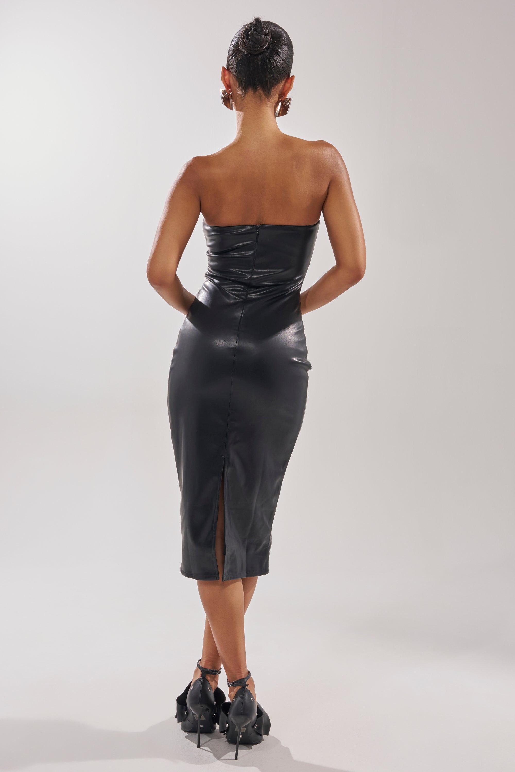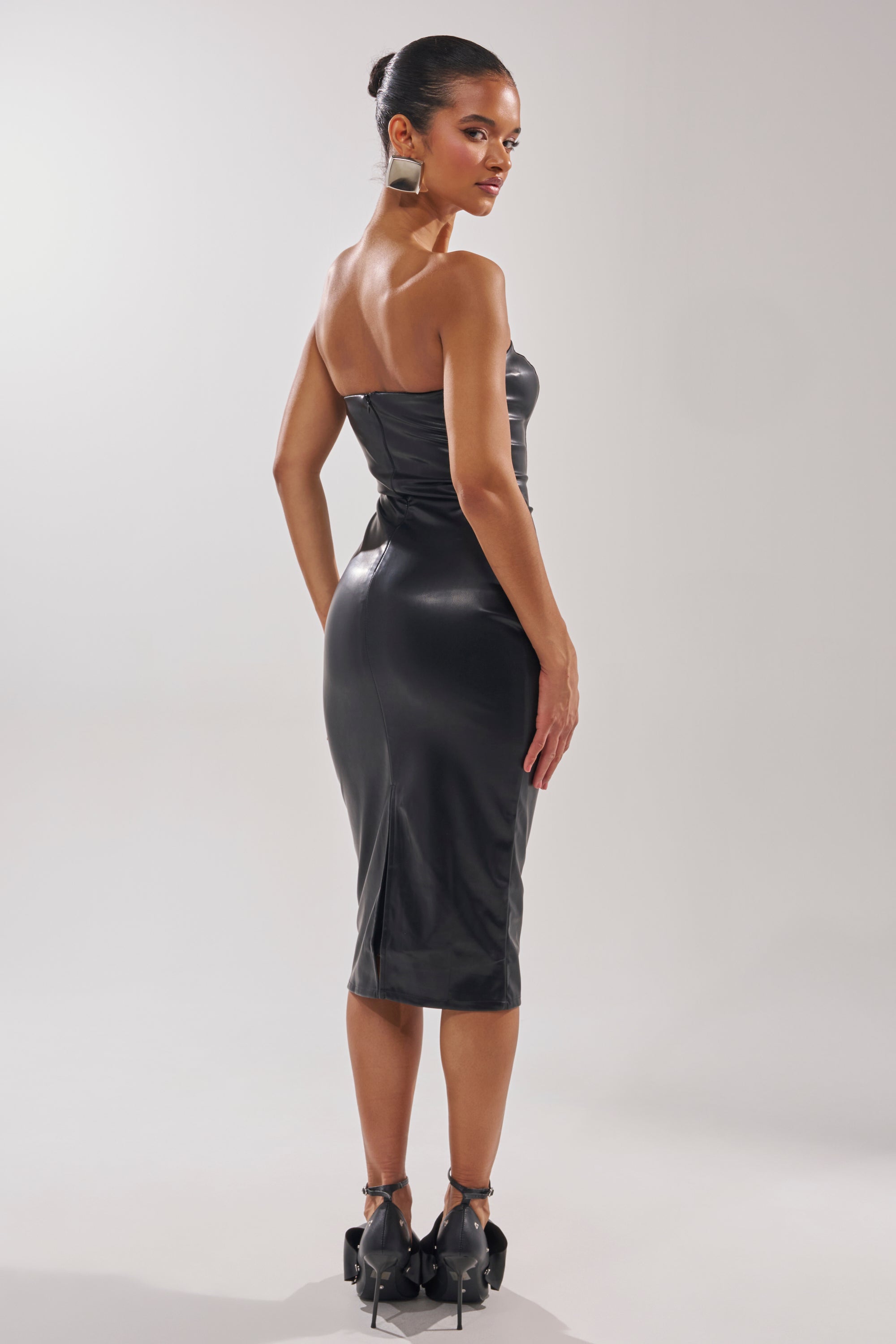 Did someone turn up the heat? Oh wait, it’s just you in the AKIRA Label Oh Hot Damn Faux Leather Midi Dress In Black. Crafted from buttery faux leather, this sultry midi dress features a strapless neckline with inner elastic trim, flattering contour seaming, a back vent slit, a concealed back zip closure, and a sleek inner lining. Complete with a curve-hugging fit. Style with stiletto pumps and chunky metallic jewelry for a sizzling finish.
