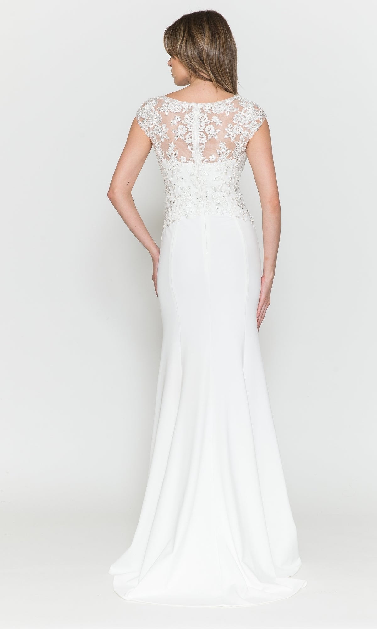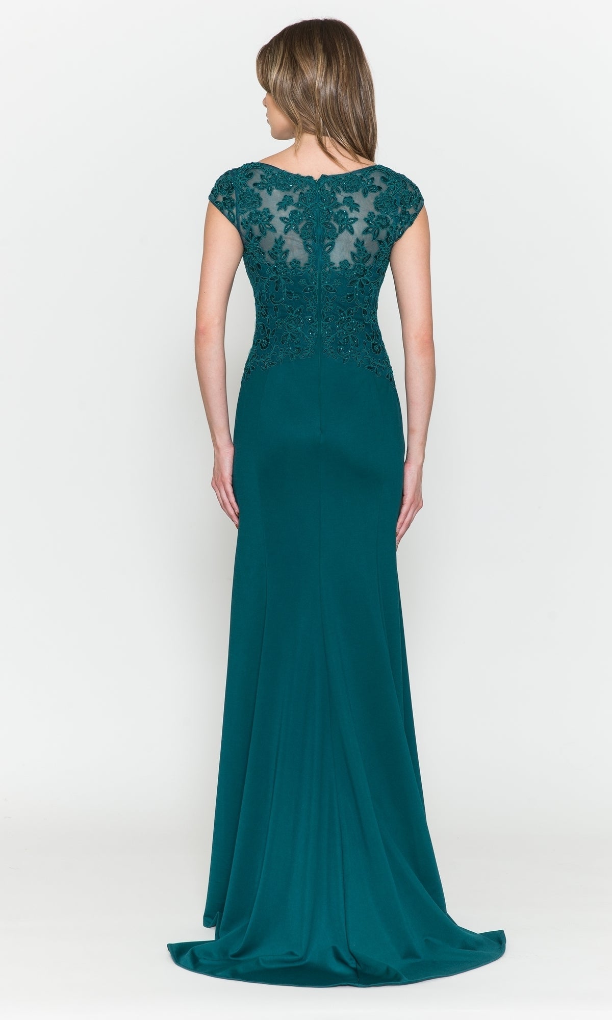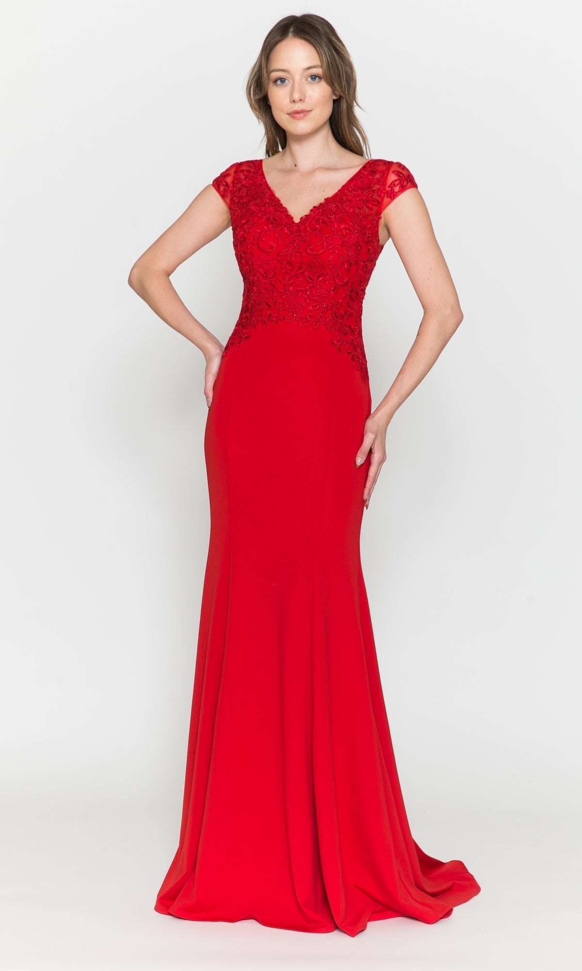 Here's a long jersey prom dress that's chic and sophisticated. Topped by sparkly accents, beautiful embroidery embellishes the bodice, sheer cap sleeves, and illusion back on this elegant v-neck prom dress. The floor-length jersey skirt fits snugly through the hips before pooling into a short train. For a fancy look that's classy too, wear this cap-sleeve embroidered prom dress.