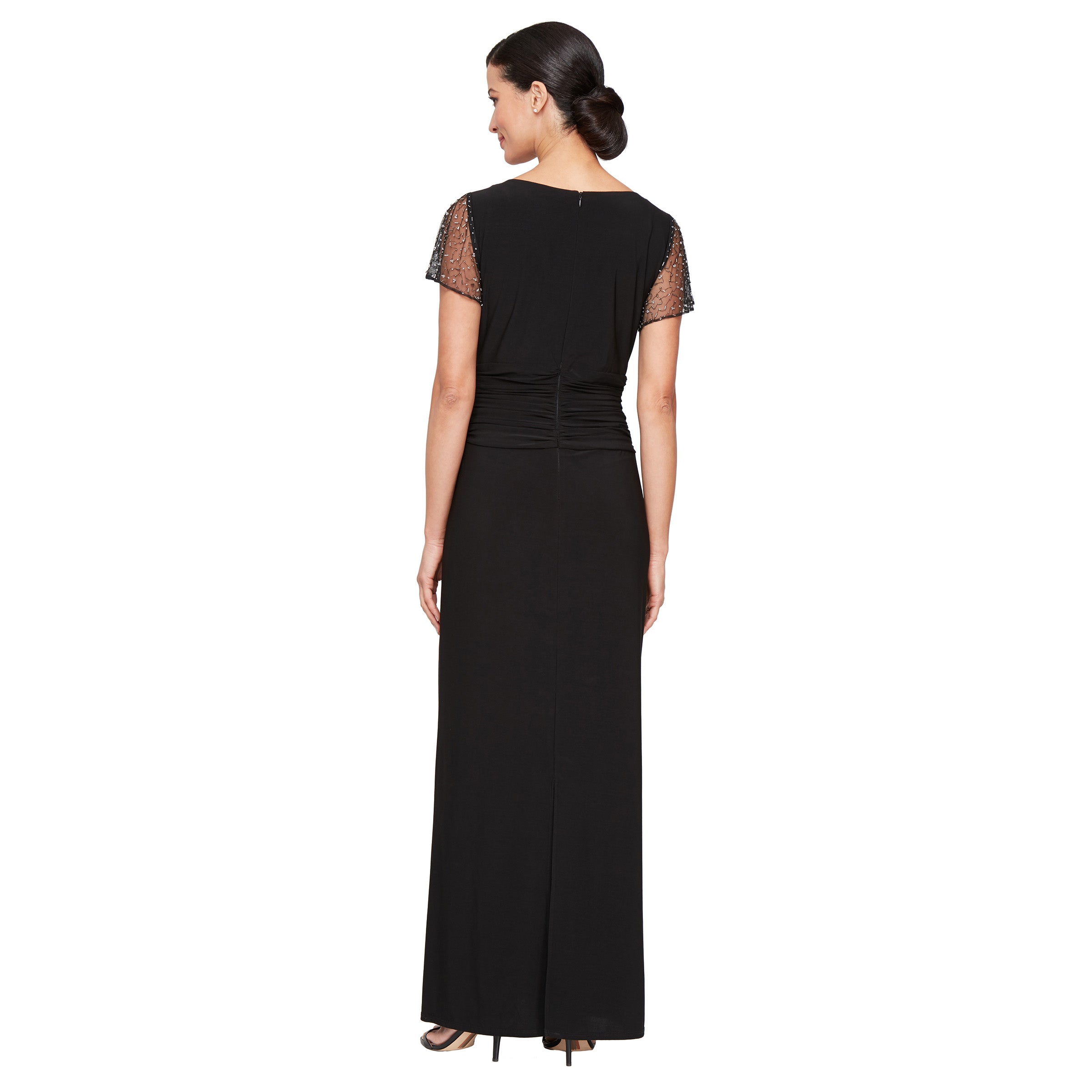 Elegance meets comfort in the SL Fashions 9135254 Long Formal Mother of the Bride Dress. Crafted from soft matte jersey, this timeless gown features a flattering ruched waist for a beautifully sculpted silhouette. The short beaded illusion sleeves add a touch of sparkle, while the square neckline enhances its sophisticated charm. Flowing to a full-length hem, this dress is perfect for weddings, galas, and evening events.
