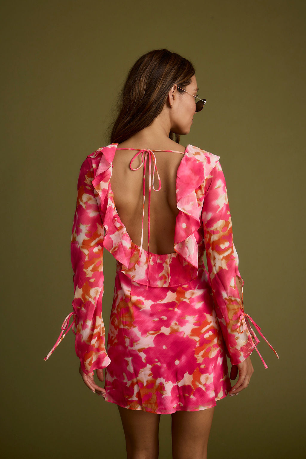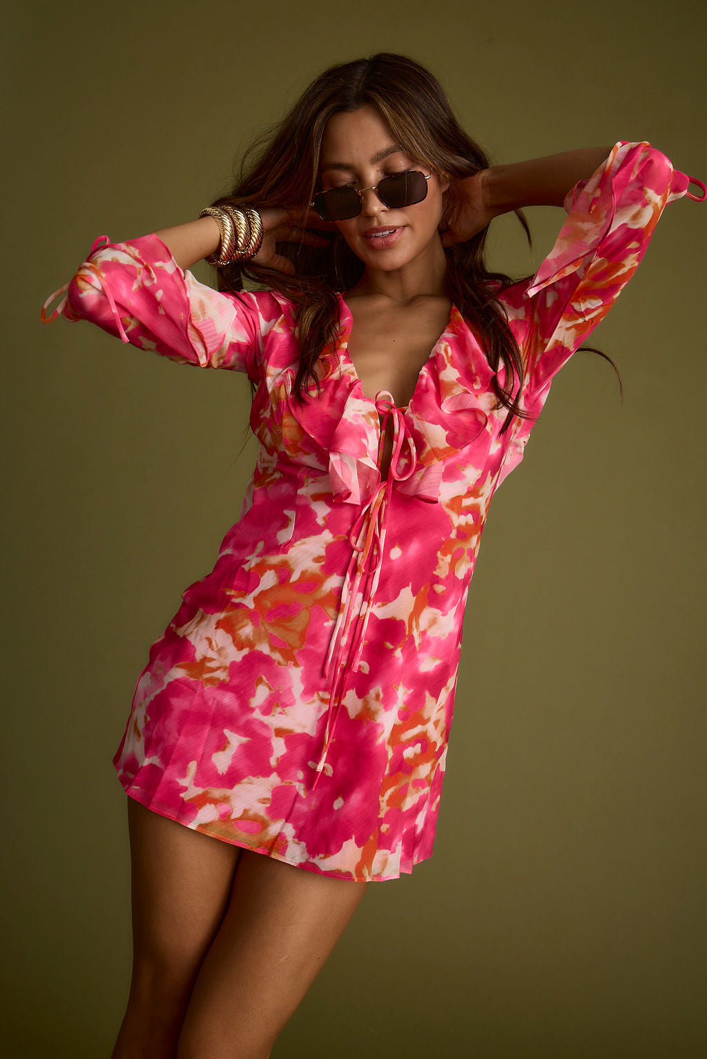 You asked for a hot pink version and we delivered! Based on our best selling Sydney Pink Ruffle Dress, we welcome the Sydney in a new vibrant HOT pink. This satin mini dress looks amazing on its own with a subtle floral print, mini length, and striking hot pink floral colorway, all we can say is prepare for serious compliments in this look.
