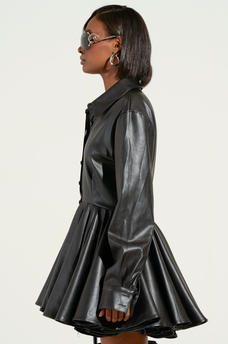 The spotlight is yours in The AKIRA Label The It Girl Mini Dress In PU. This chic piece is crafted from stretchy, buttery soft faux leather and features a pointed fold-over collar, a tonal button down front closure, long button cuff sleeves, smooth inner lining, and a flouncy, full-bodied pleated skirt. Style it with patterned tights and platform mary janes and embrace your It-Girl status.