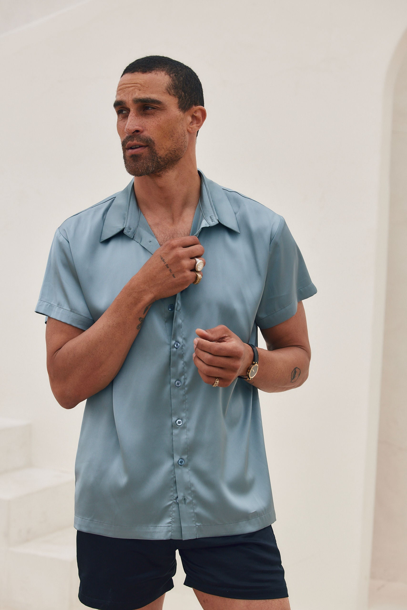 - blue satin short sleeve men's top