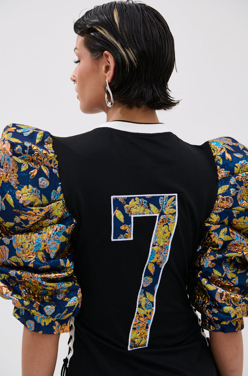 Stun court-side in The AKIRA Label Vibin’ On The Sidelines Jersey Mini Dress. The bodice of this hybrid mini is crafted from black athletic mesh, complete with contrast white trim at the crew neckline and lace-up sides for adjustable cinching. Voluminous puff sleeves are made from a metallic floral brocade in gold, blue, and green, matching the oversized appliqué “7” on both the front and back. The slim, tailored silhouette hugs the figure while the mixed materials add unexpected texture play. Style with knee-high boots and a coordinating clutch for a total slam-dunk.