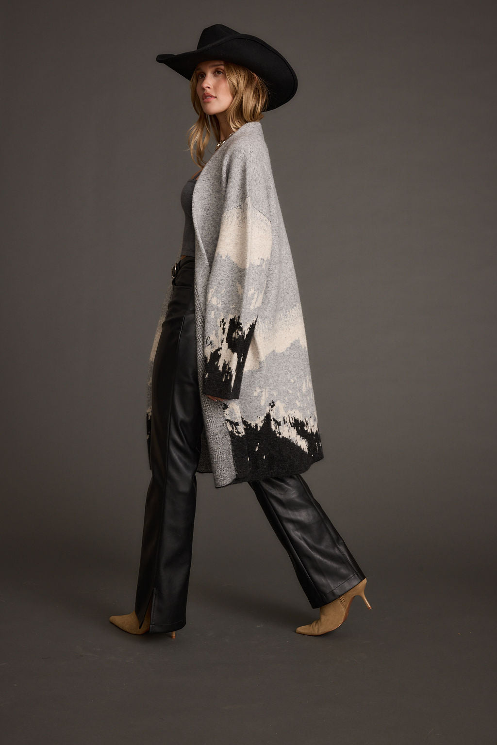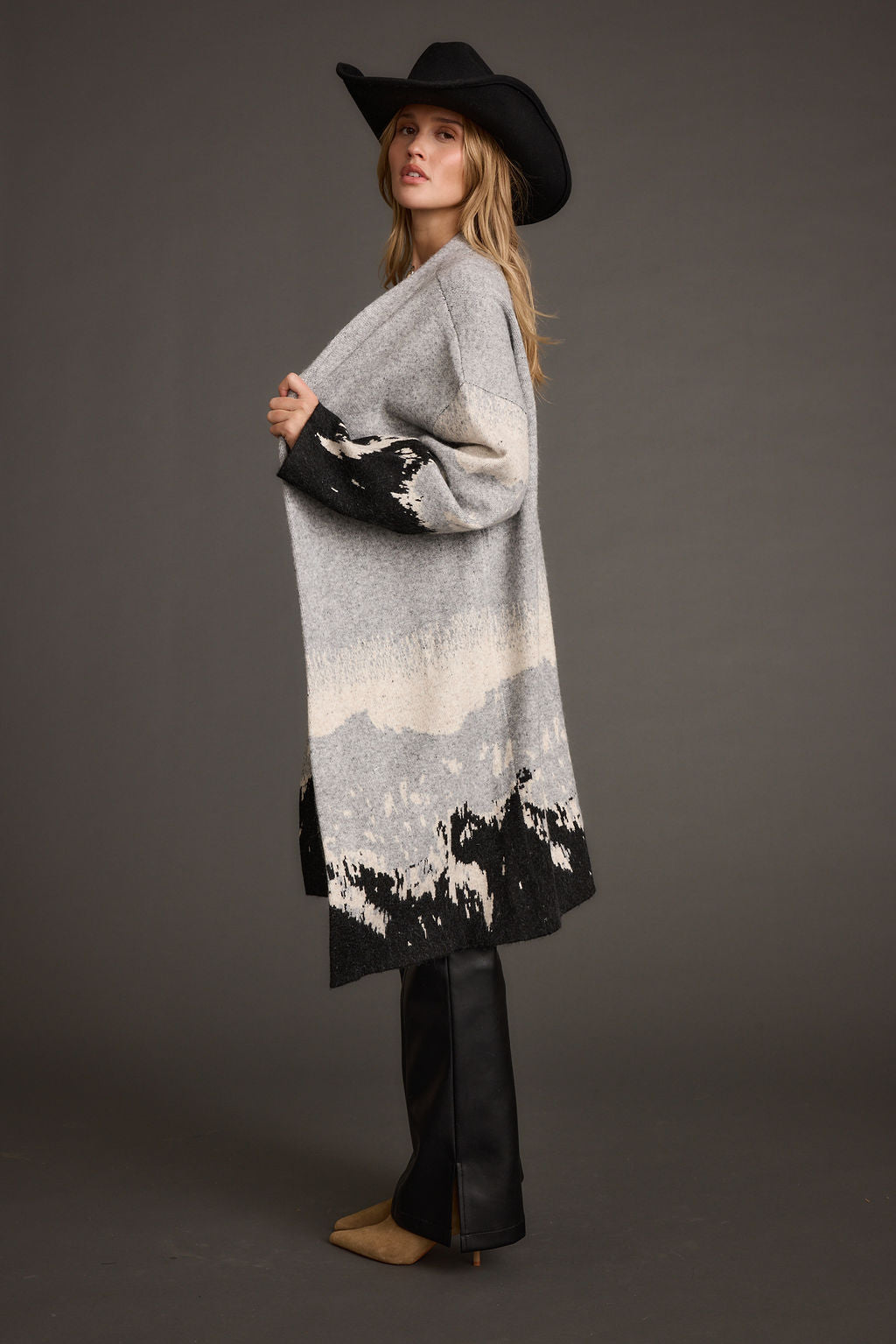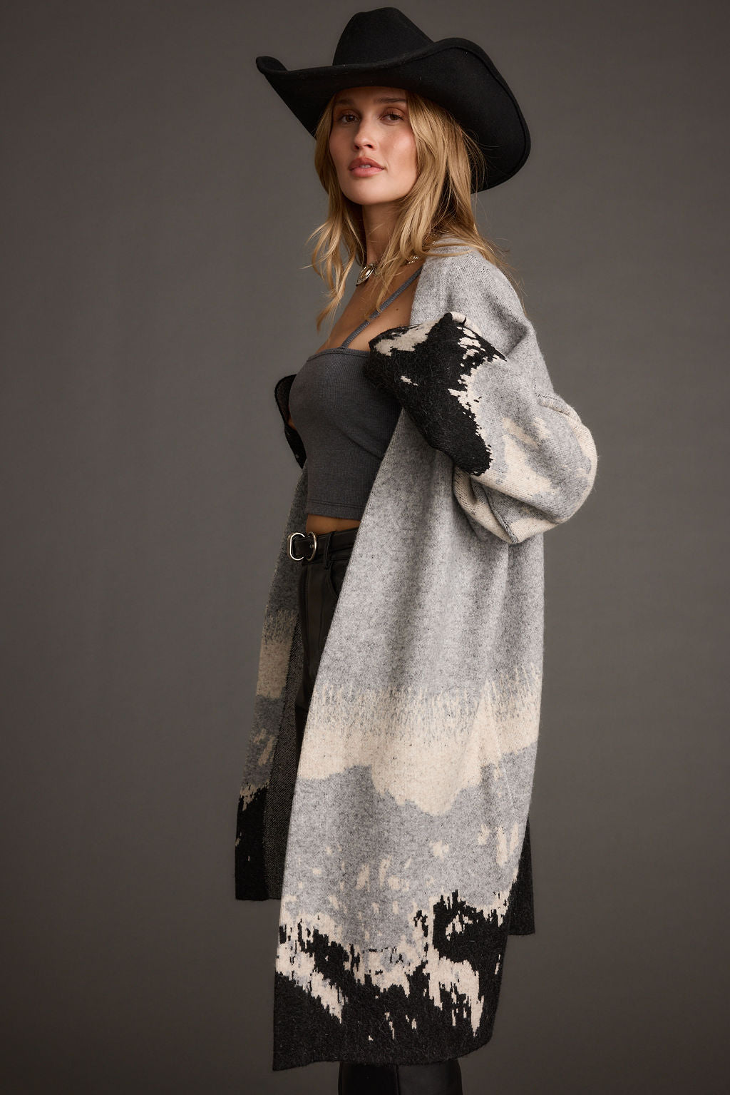Sweater weather never looked so good. Layer up in the Yellowstone Printed Duster Cardigan. This grey long duster cardigan with drop sleeves with creams detailing and mountain skyline is giving us major mountain chic vibes. Top is off with a cowboy hat, and wrap yourself in style all winter long.
