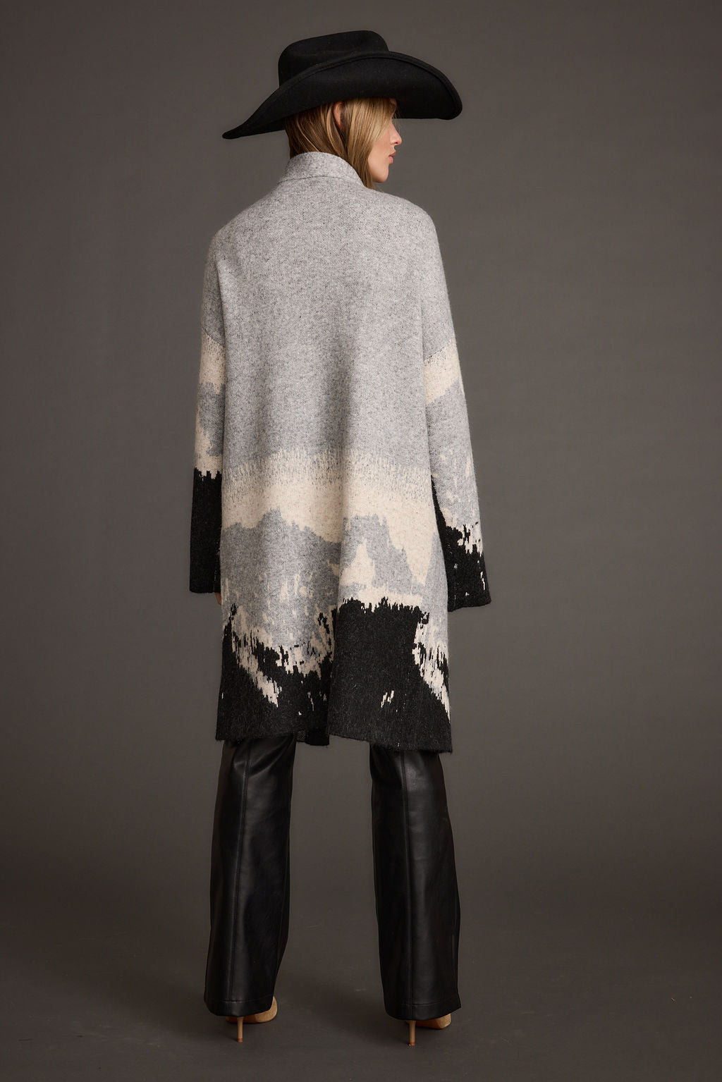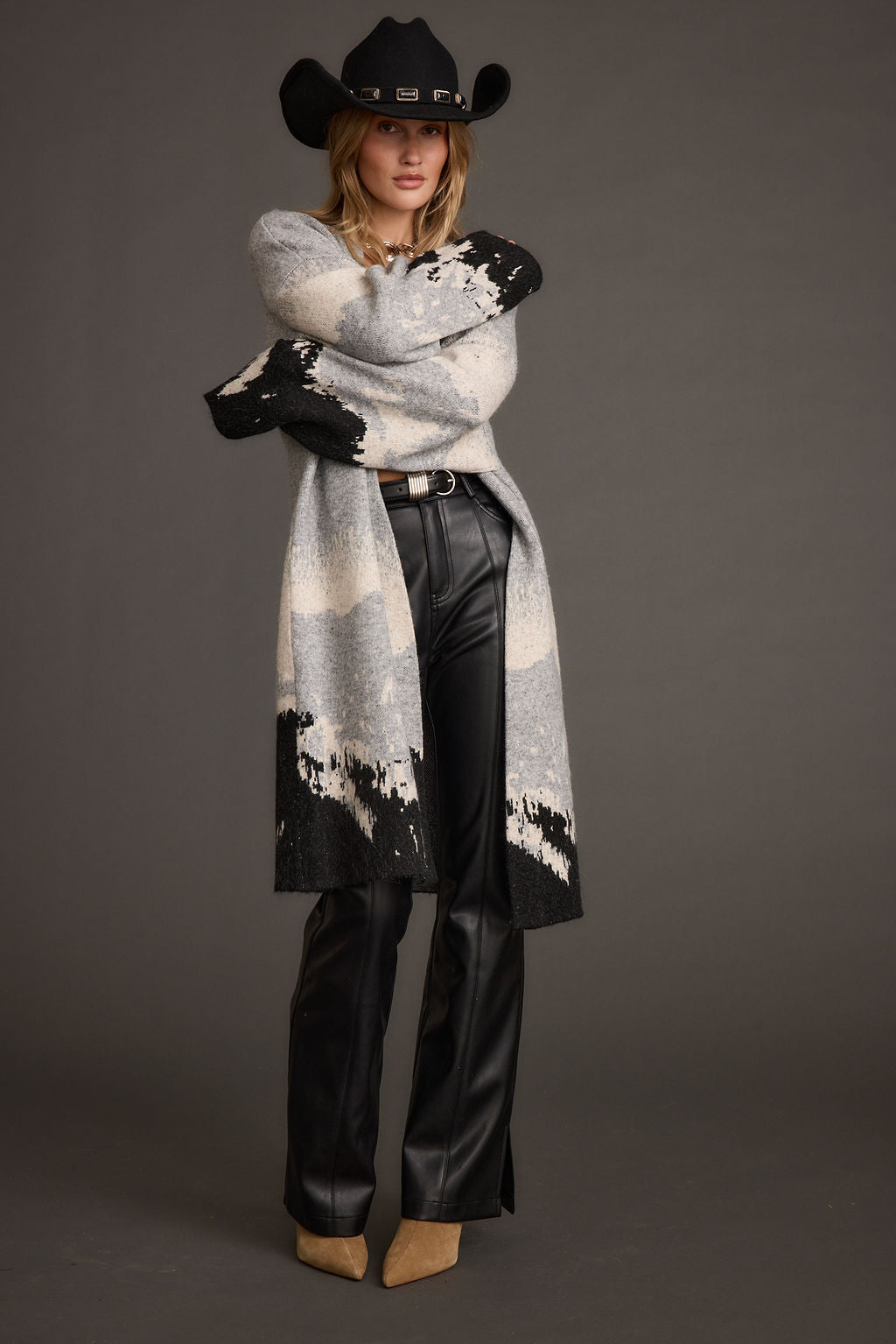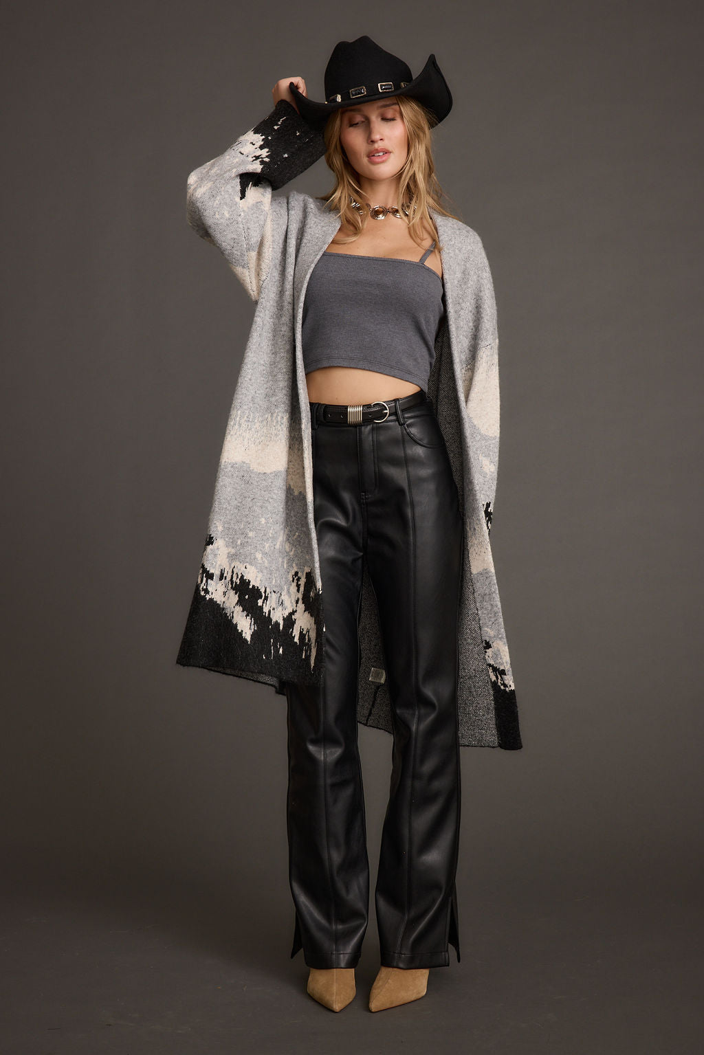 Sweater weather never looked so good. Layer up in the Yellowstone Printed Duster Cardigan. This grey long duster cardigan with drop sleeves with creams detailing and mountain skyline is giving us major mountain chic vibes. Top is off with a cowboy hat, and wrap yourself in style all winter long.